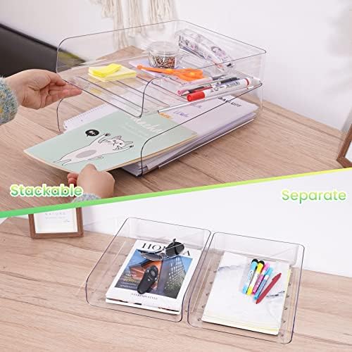 Tomorotec Desk Letter Tray Set 2-Pack Front Load A4 Size Clear PET Stackable Document Organizer Office Desktop File Paper Holder Book Storage Rack Anti-Skid Stacking Support Convex Bottom Grooved Snap