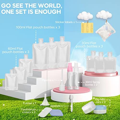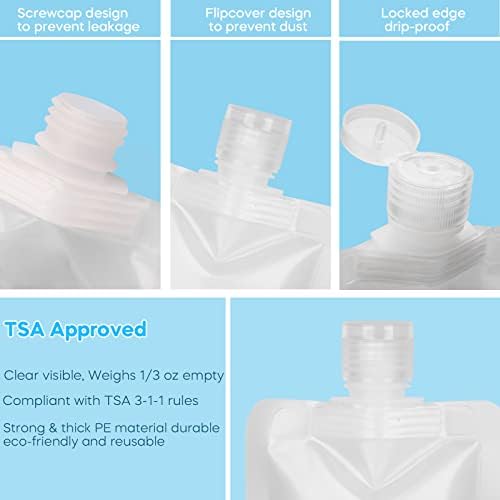 ✈️【Compact Design】The clear pouches for liquid with a stand-up spout makes it easy to see the liquids inside and there are labeled sheets for sorting them. Each bag has a flip-top lid for a tight seal that’s less likely to spill or break, and squeeze flow-wrap technology for easy squeezing without wasted drops.